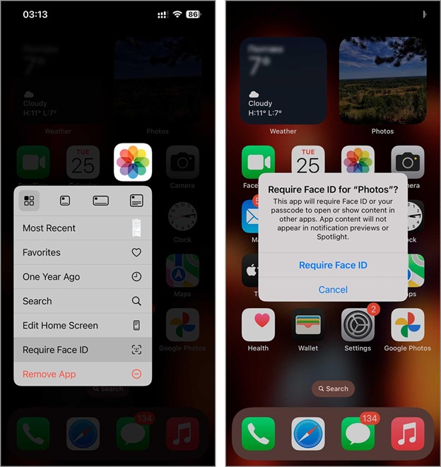 Now, you can also lock the Photos app with Face ID for extra security. To activate this feature, locate the Photos app on the home screen, press and hold its icon, and choose the "require Face ID" option. Follow the steps displayed on the screen to complete the setup. With this in place, accessing private content within the Photos app requires a separate verification, even if the main security of the iPhone has been bypassed.