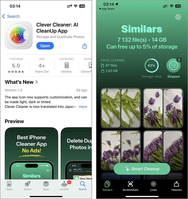 The App Store has plenty of options, but for this guide, we’re using Clever Cleaner: AI CleanUp App. Why? Because even though its feature set is small, it’s super effective for cleaning up your photo storage without losing anything important. And the best part is that It’s completely free, no paywalls, no ads. Now, let’s walk you through how to use it, starting with its “Similars” feature, which helps you find and remove duplicate and similar images. We’ll cover its other features a little later.
