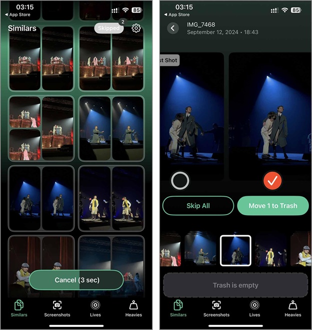 - For a more selective cleanup, tap on any grouped photos. Review the app’s selections and check the boxes for the images you wish to delete, then select ‘Move to Trash.’