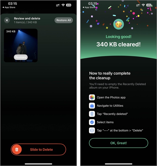 - The photos you marked will move to the app’s trash bin. You can review these photos and restore them if necessary before final deletion. Then, slide the ‘Slide to Delete’ control.