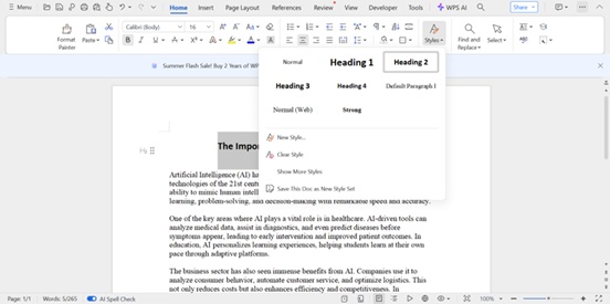 WPS Office currently doesn't have a one-stop "Export to PowerPoint" button. Still, if you implement proper formatting—such as using Heading 1 for headings and Heading 2 or bullet points for body content on slides—you can format your Word document to be easily convertible to slides. Saving the Word document as a PDF and then adding it to WPS Presentation preserves layout elements.
