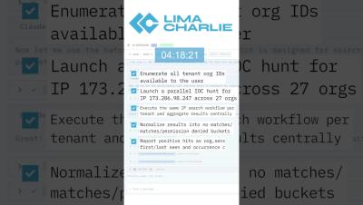 See Claude Code execute a parallel IOC hunt for a suspicious IP across multiple LimaCharlie organizations. The agent enumerates all available tenants, launches concurrent searches, normalizes results into match categories, and reports positive hits with sensor details, timestamps, and occurrence counts. Security teams can investigate threats across their entire fleet without manually querying each tenant.
