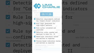 Watch Claude Code generate production-ready Cobalt Strike detection rules in LimaCharlie. The agent defines detection requirements, creates rule logic for high-signal patterns, validates syntax, and deploys rules to the tenant. Named-pipe indicators and process-based signatures are tested against positive and negative controls to confirm accuracy. Security teams can operationalize threat-specific detections in minutes instead of hours.